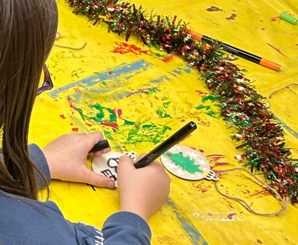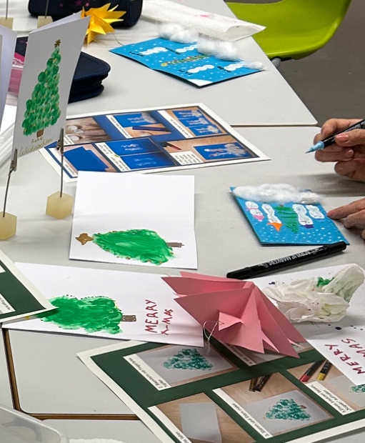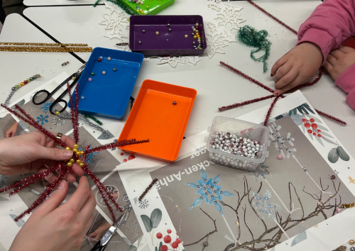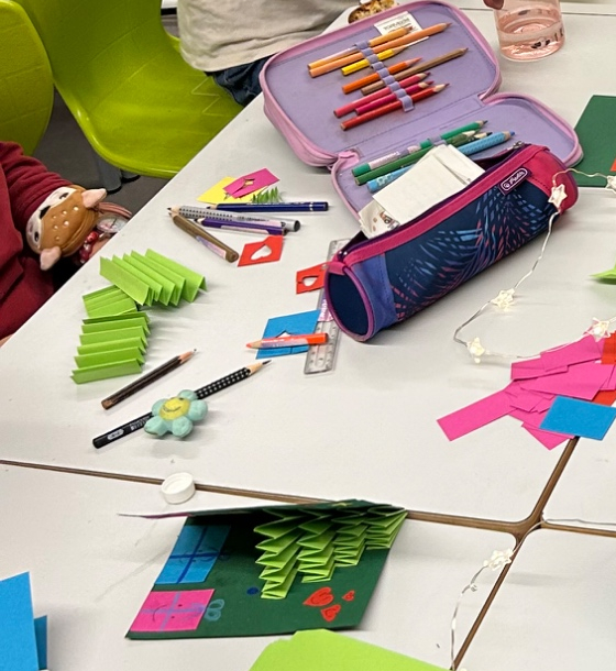 Anfang Dezember waren alle Kinder des roten Lernhauses zusammen mit ihren Eltern und Geschwistern zum gemeinsamen weihnachtlichen Basteln eingeladen. Sowohl die Lehrkräfte als auch das KJR-Team hatten Material und Anleitungen bereitgestellt. So konnte in mehreren Räumen nach Herzenslust gebastelt werden. Dabei entstanden kunstvolle Sterne aus Pfeifenputzern und Perlen, Karten mit Weihnachtsbaum- oder Schneemannmotiven, Stecksterne aus Papier, bemalte Holzanhänger sowie lustige Schneemänner und Kugeln aus Papier. Dazu gab es Tee und mitgebrachtes Weihnachtsgebäck.
